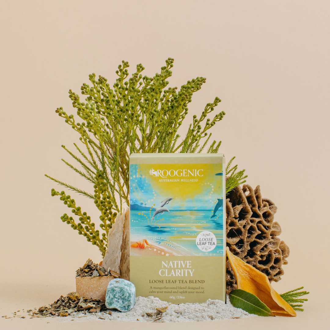 Calm your mind and find your clarity with Native Clarity Tea, a mango-infused tea supported by stress-reducing ginseng, anxiety-relieving passionflower and three Australian native plants.